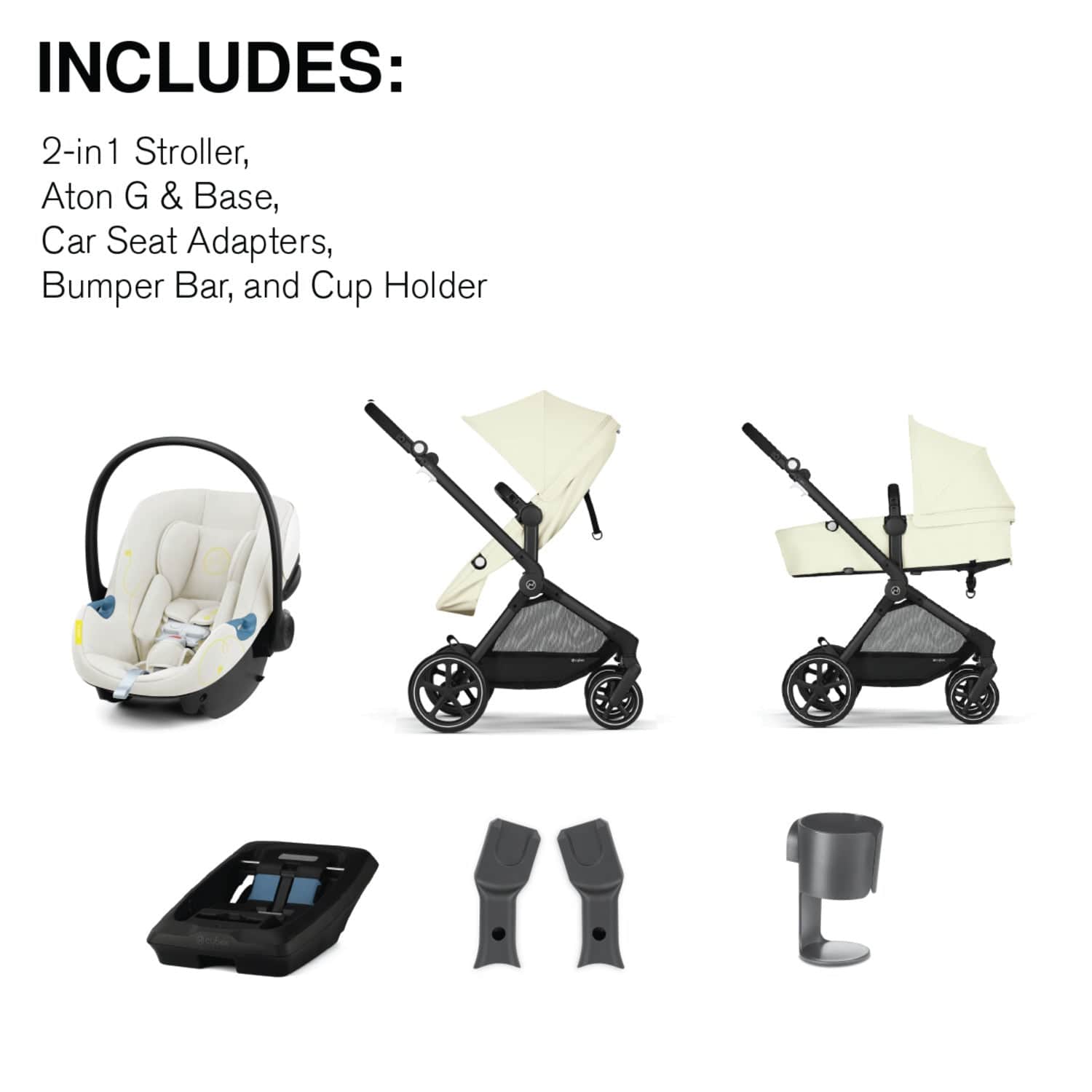 The CYBEX EOS Stroller + Aton G Infant Car Seat is a perfectly streamlined Travel System for your growing family. A complete travel solution from birth, it features a 2-in-1 seat unit that easily converts from lay flat “carriage mode” for your newborn to a reversible toddler seat when your child grows bigger – no extra components or accessories required. Additionally, you can use the included adapters to attach the Aton G Infant Car Seat to create the ideal travel system.